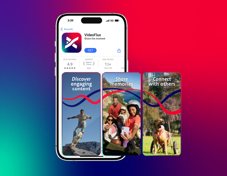 VideoFlux is a hypothetical short-format video sharing mobile app hoping to stand out as the next engaging and dynamic social media platform. The challenge was to cut into an ever-popular short-form video sharing field with an edgy, high energy brand that stands out amongst its competition. This was accomplished through vibrant colors and motion in the logo design and brand assets.